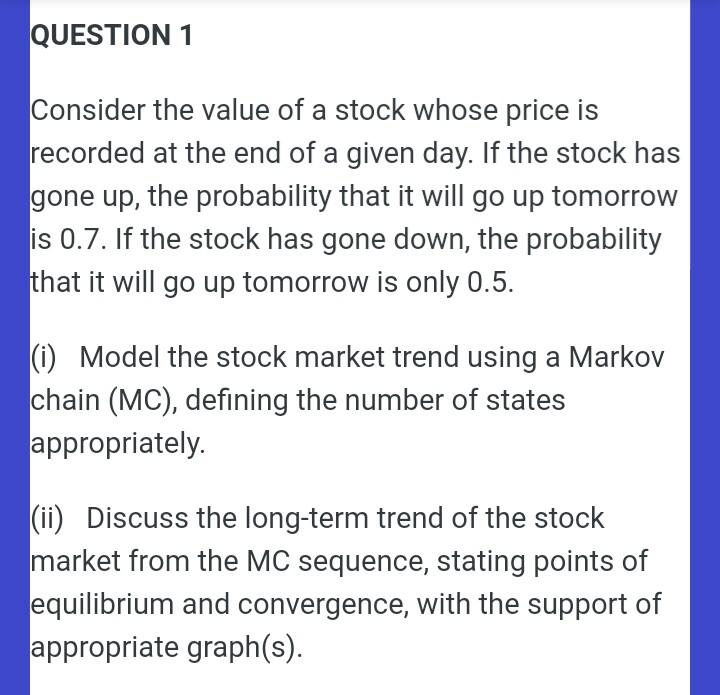 Solved Consider The Value Of A Stock Whose Price Is Recorded At The End Of A Given Day If The Stock Has Gone Up The Probability That It Will Go Up Tomorrow